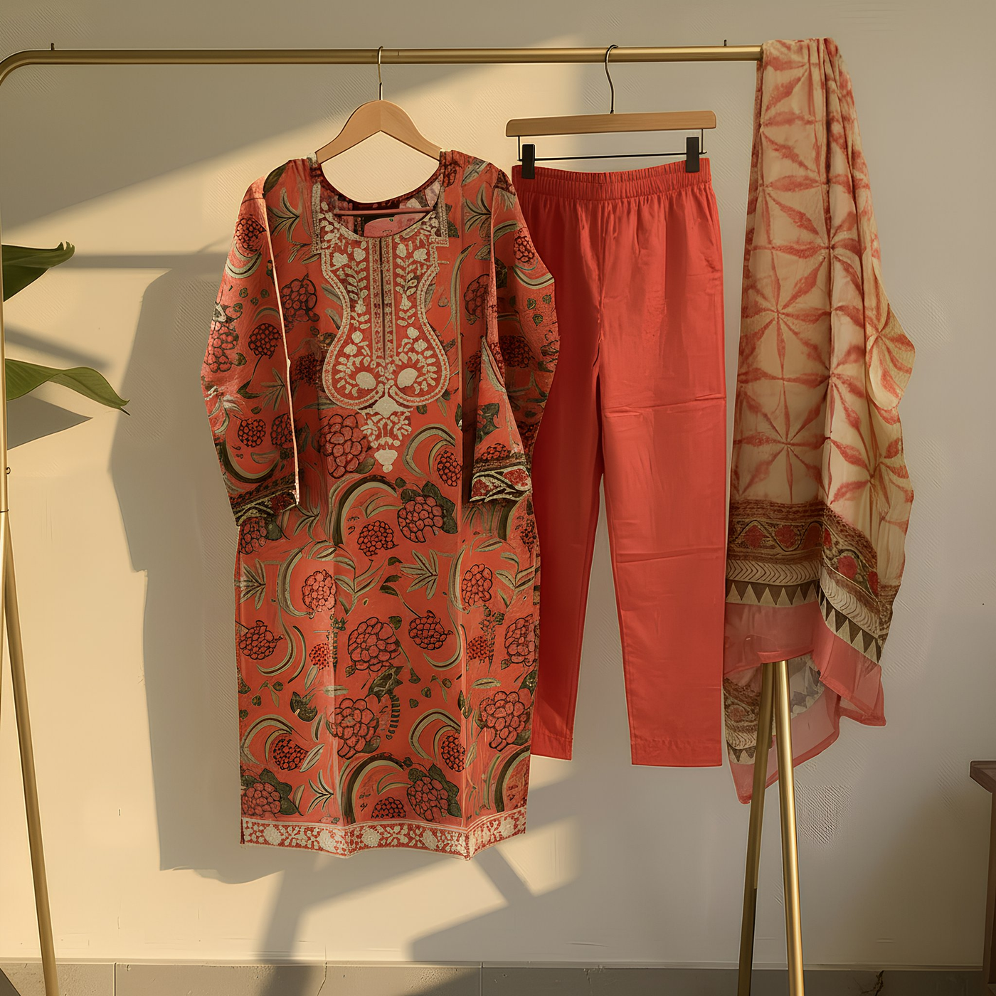 Dupatta: Lightweight printed dupatta featuring traditional tie-dye inspired patterns and ethnic motifs with elegant border detailing that enhances the overall look