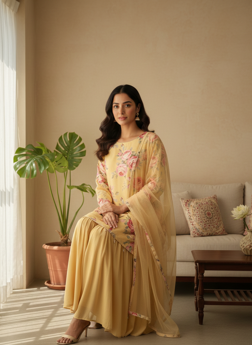 Type: Printed Kurta with Sharara & Net Dupatta