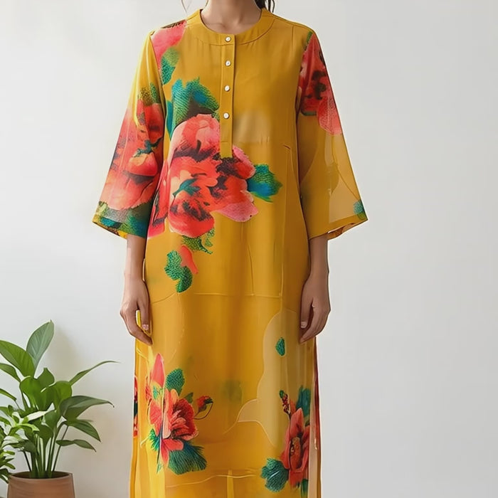 Color: Mustard Yellow with bold red & green floral prints
