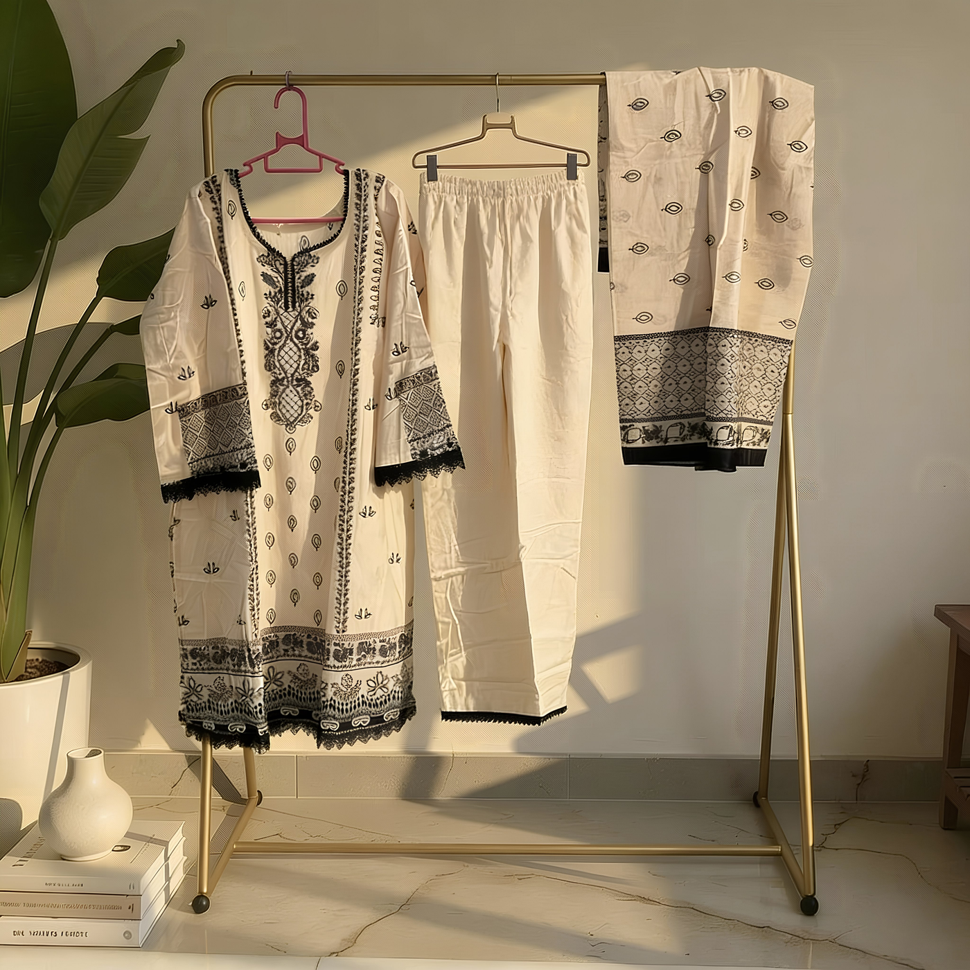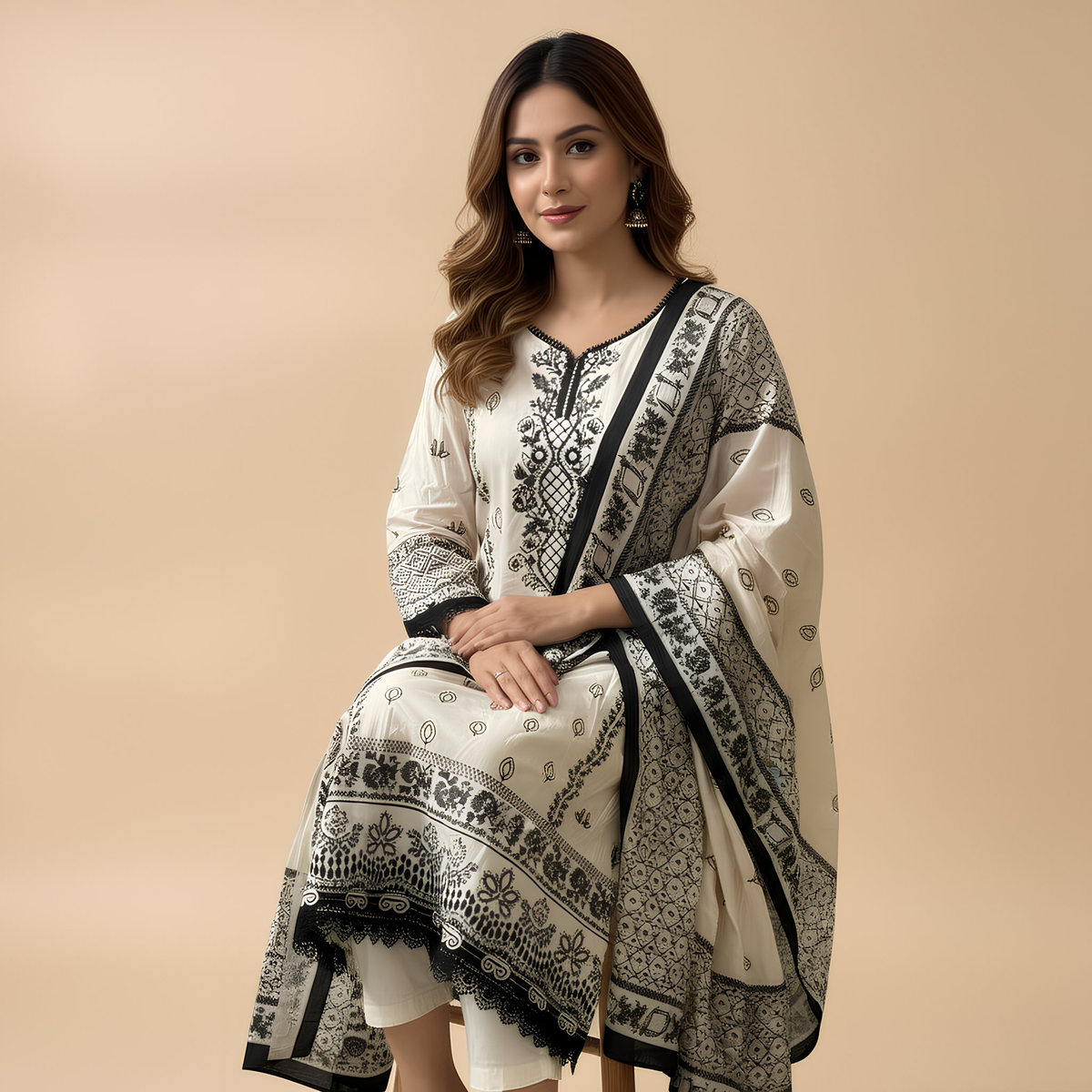 Work: Elegant all-over traditional motifs with contrast black floral embroidery-style print on the neckline, coordinated sleeve borders, and detailed hemline finishing