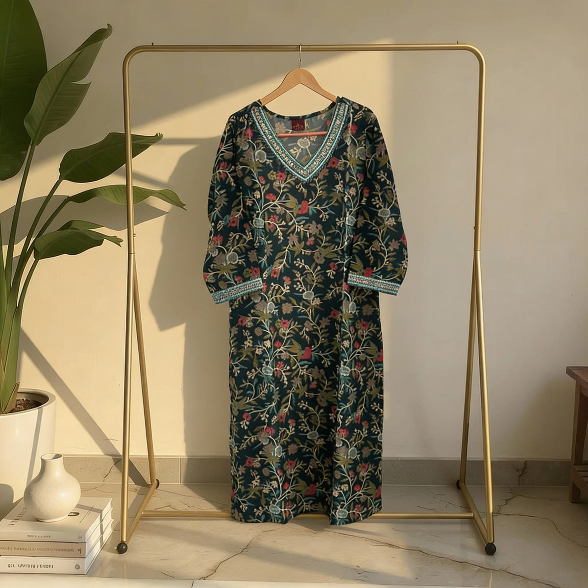 Dark Green Floral Printed Embroidered Neck Kurta HO2 XL15
