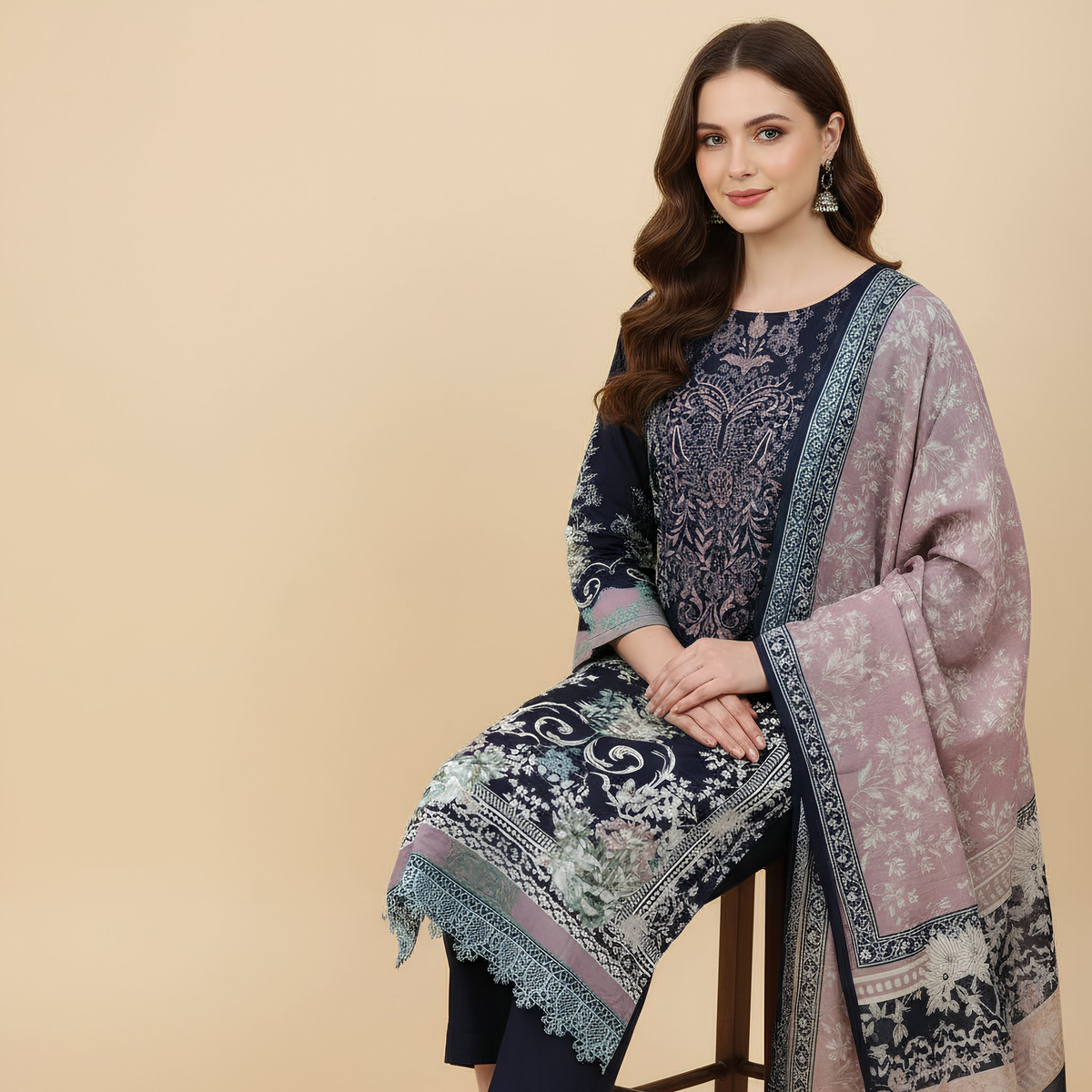 Dupatta: Lightweight printed dupatta featuring floral motifs with an elegant contrast border that complements the suit beautifully