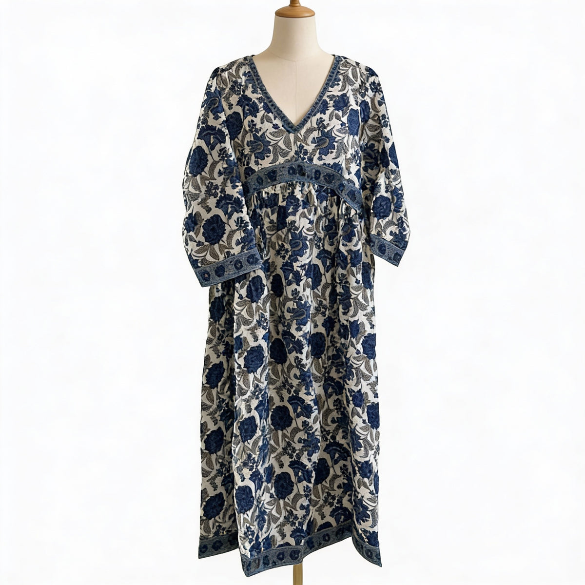 Work: All-Over Floral Print with Contrast Printed Empire Waist Panel, Neckline Border, Sleeve Cuffs, and Hem Detailing