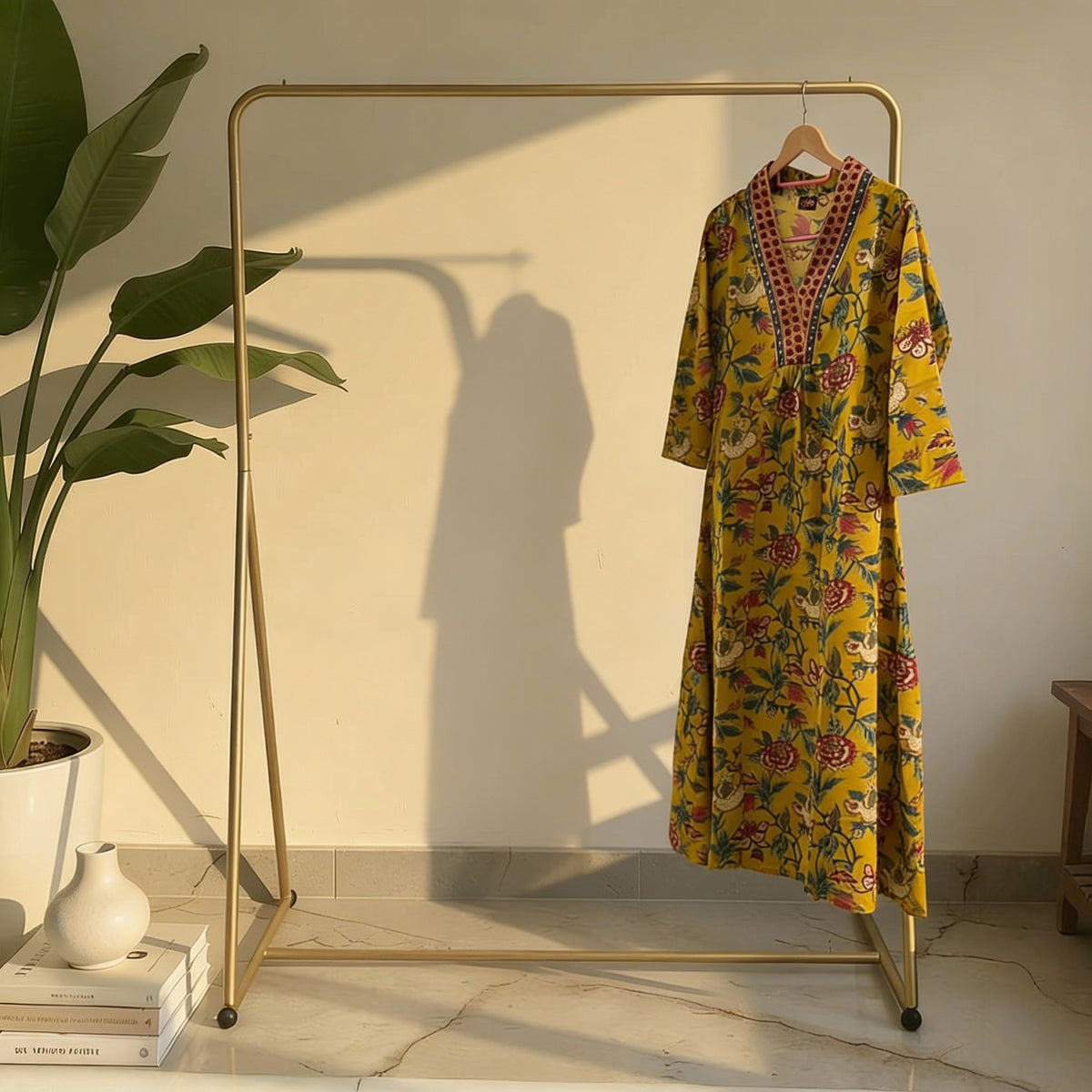 Ivory & Mustard Floral Printed Gathered Kurta HO2 XL14