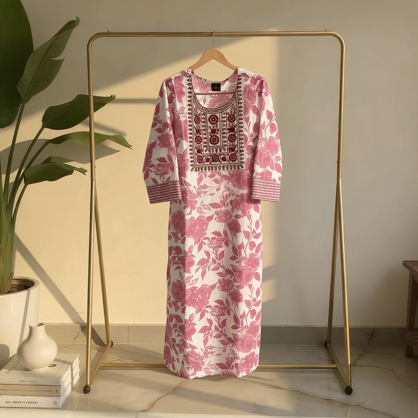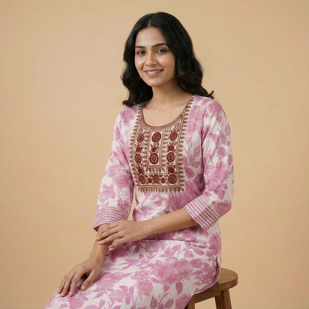 Work: Floral Print with Contrast Thread Embroidery on Yoke and Detailed Sleeve Borders