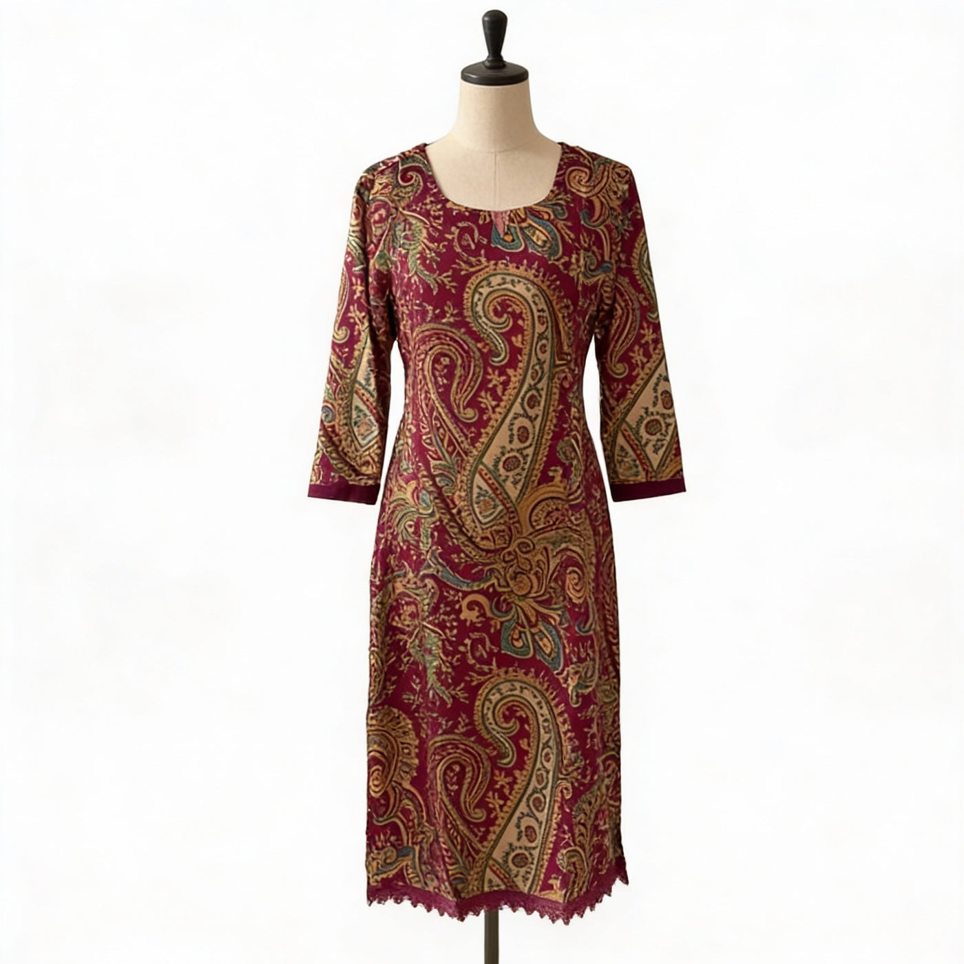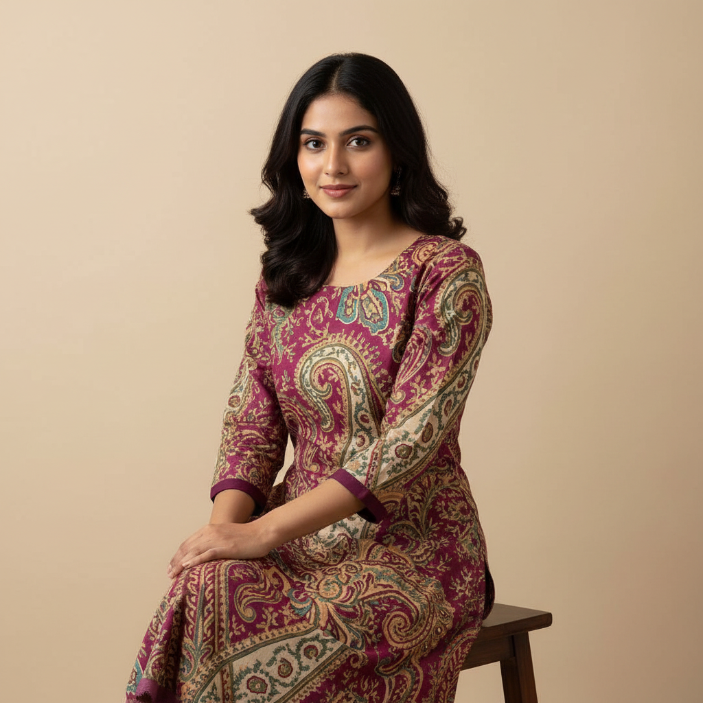 Work: All-Over Traditional Paisley Print with Contrast Border Detailing on Sleeves and Hem