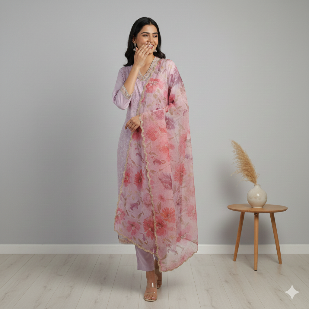 Color: Lavender Kurta Set with Pink Floral Dupatta