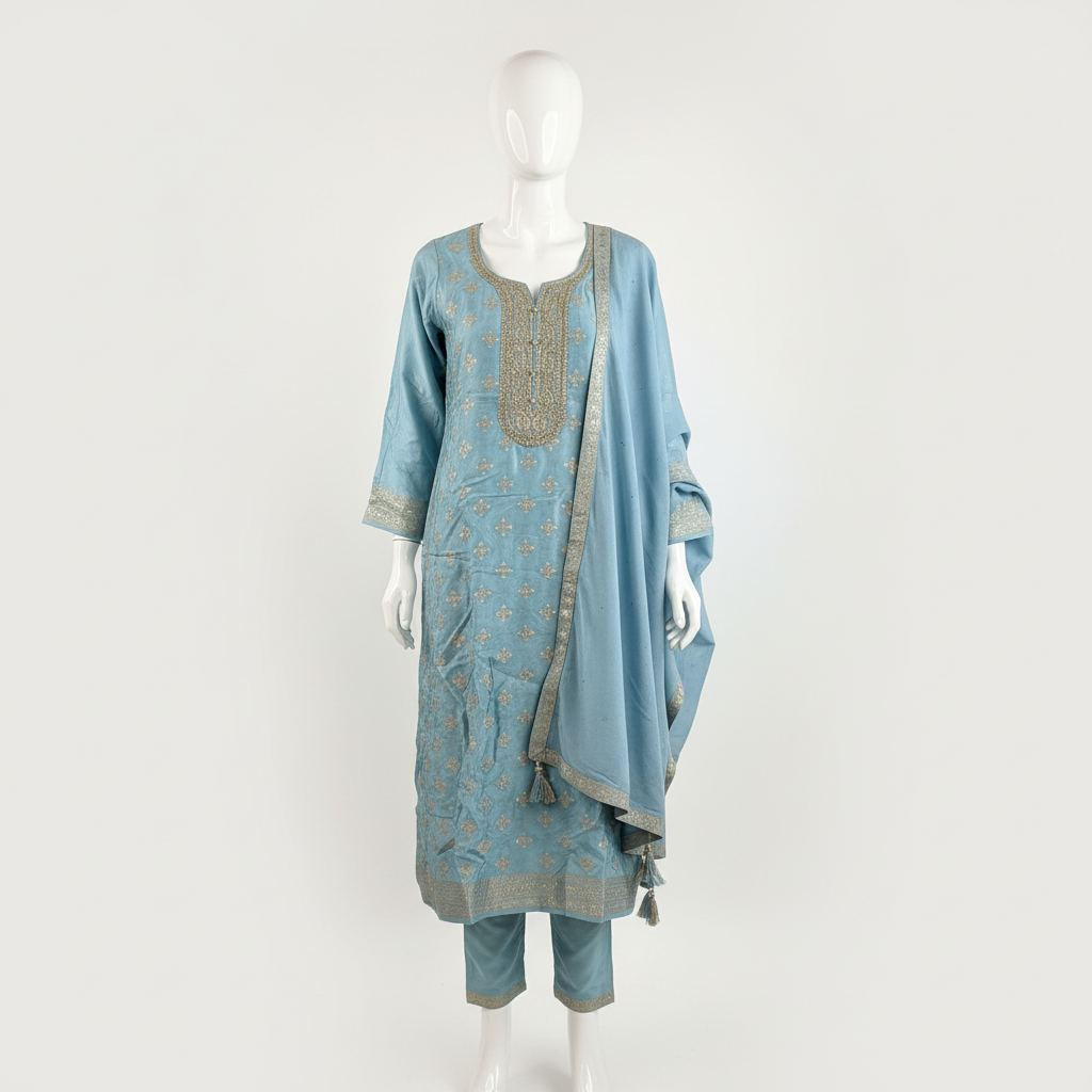 Work: Intricate Silver Thread Embroidery on Neckline, Yoke, Sleeves & Hem with Scattered Motif Work