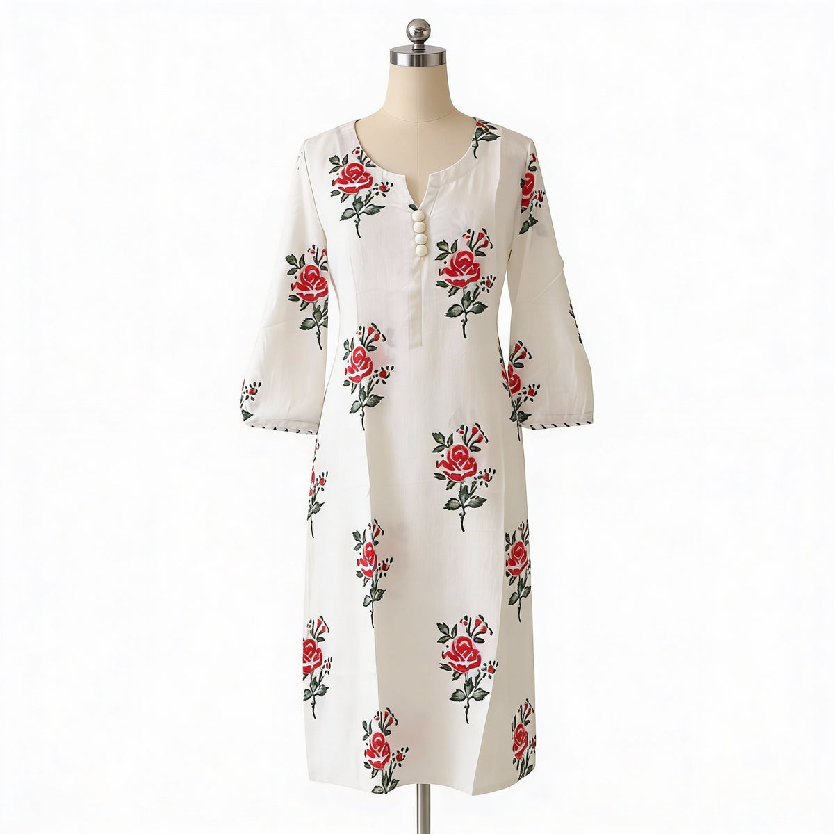 Work: All-Over Floral Rose Print with Fabric Button Detailing on Neckline and Subtle Sleeve Edge Finish